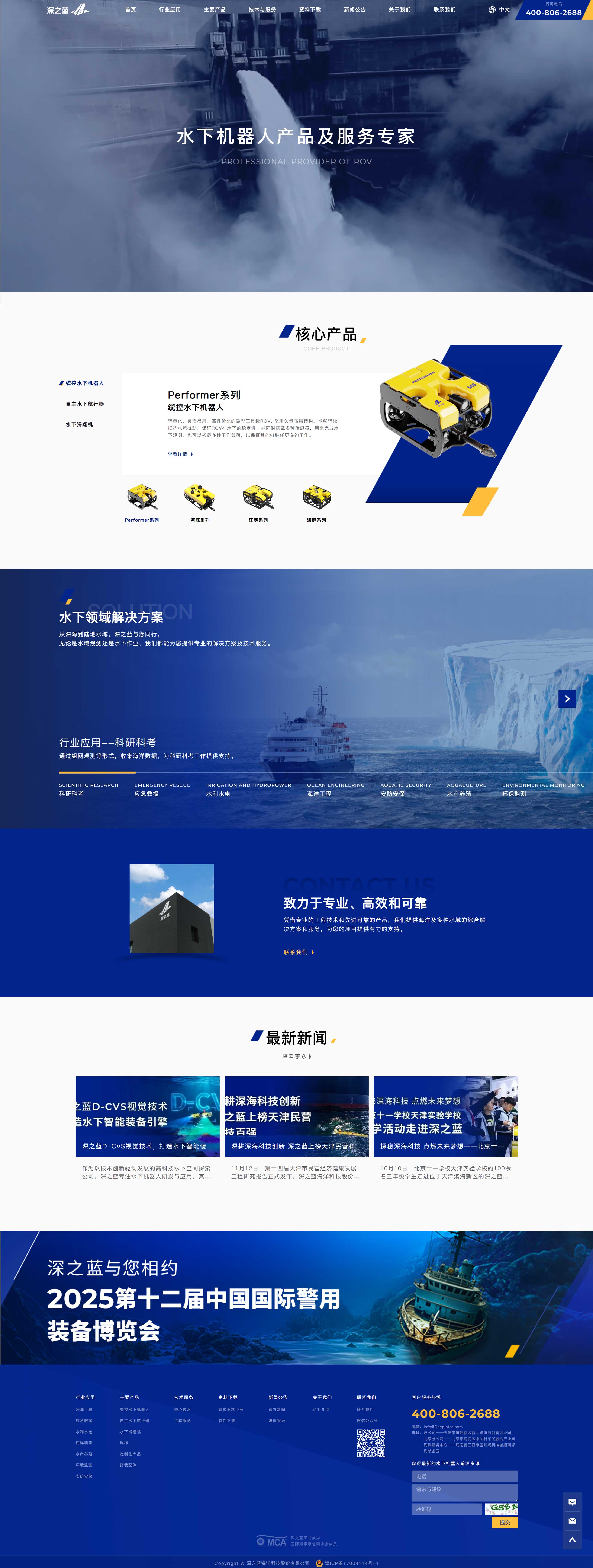 访问网站深之蓝以“探索水下新世界,为人类水下资源开发保驾护航”为使命,是国内水下机器人行业的开拓者与引领者,是一家以技术创新驱动发展的高科技水下空间探索公司。